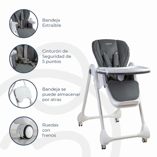 La Silla de Comedor Bebesit es ideal para Bebés de 7 a 36 meses, soportando entre 5 kg y 22 kg. Fabricada con una estructura de acero y revestimiento de poliéster, garantiza comodidad y seguridad con su arnés de 5 puntos, sistema de anclaje con 3 posiciones de reclinado y acolchado lateral para protección contra impactos. Su diseño práctico incluye un respaldo desmontable, reposapiés ajustable y bandeja de alimentos en 3 posiciones, facilitando su uso y limpieza. Certificada bajo la norma BS EN 14988:2017+A1:2020, es una opción segura y confiable para la hora de comer.
